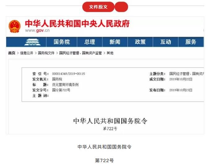 中華人民共和國國務院令第722號《優化營商環境條例》已經2019年10月8日國務院第66次常務會議通過,現予公布,自2020年1月1日起施行。總 理 李克強2019年10月22日優化營商環境條例