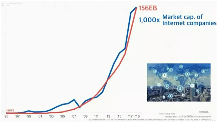 這是全球網絡的流量,橫坐標是年份。紅色的線代表流量。從最早的1995年到2018年,網絡的流量,增加了100萬倍。我們再來看另一條藍色的線。藍色的線,表現的是23年來全球互聯網公司的市場價值(市值)。