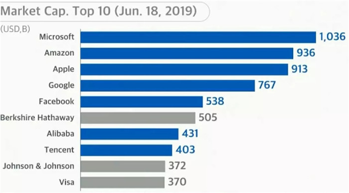 而今天,2019年市值十大的公司:微軟、亞馬遜、蘋果、谷歌、臉書、阿里巴巴、騰訊,全都是網絡公司。全世界市值十大的公司里,有七家是網絡公司。