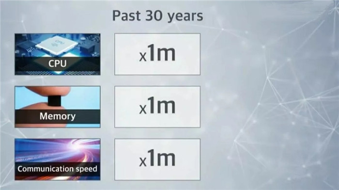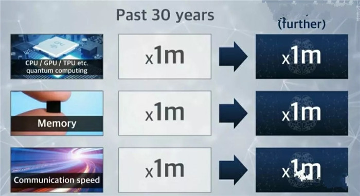 各位,處理器的運算能力,記憶體的儲存能力,互聯網的傳輸能力,在這30年來,都成長了100萬倍。30年來,成長的幅度是這樣,那再過30年呢?