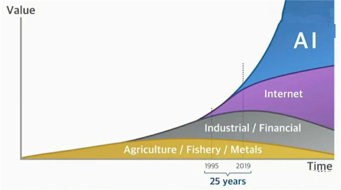 豎軸代表價值,橫軸代表時間,底部的黃色,代表農業,其價值與時間的比例一目了然;灰色代表工業,紫色代表互聯網,也就是我們正處的時代;而未來最有價值的東西,是屬于藍色的,是屬于AI的。